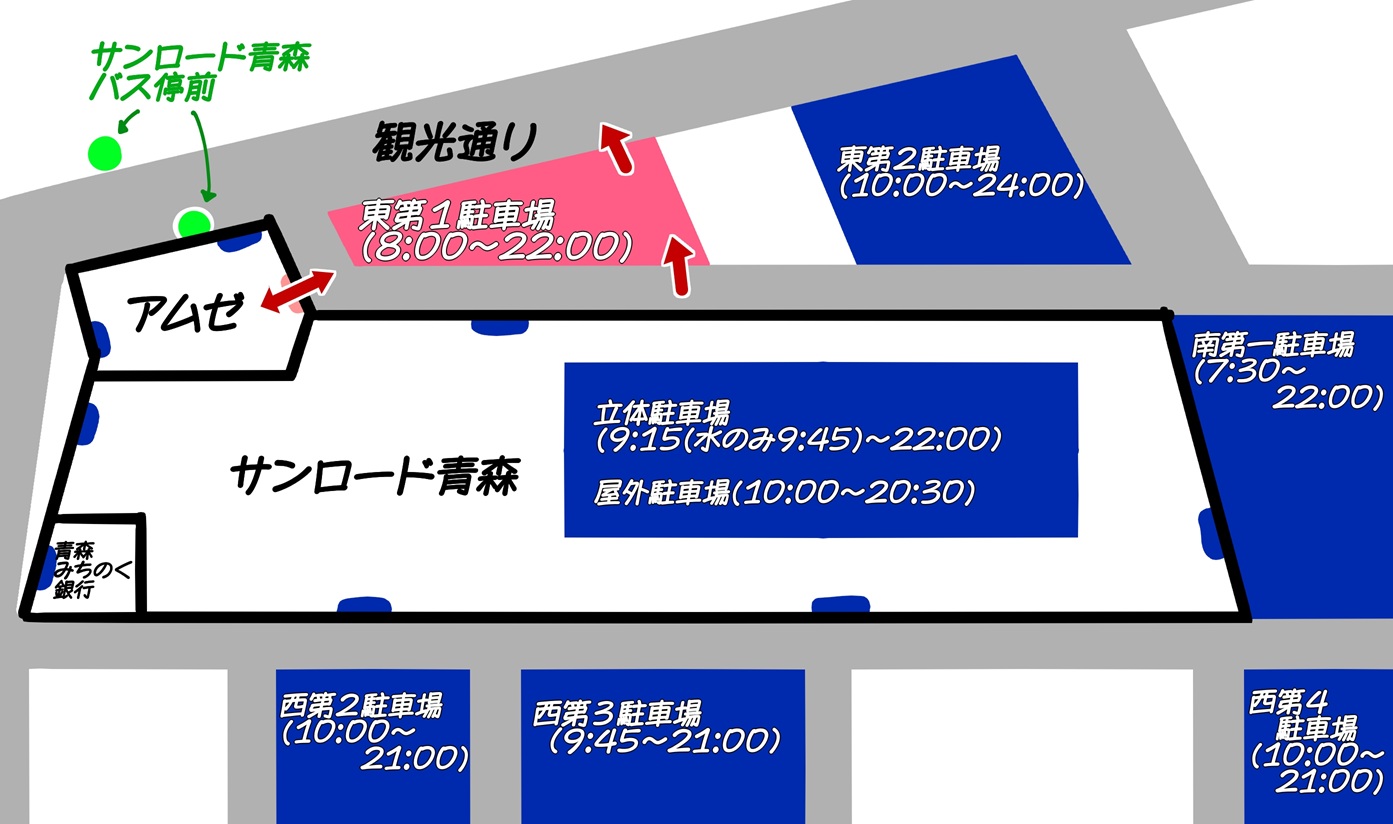 | サンロード青森の10:00開店前に入場される方は アムゼ出入口をご利用ください。 駐車場はサンロード青森 東第1駐車場をご利用ください。 ※サンロード青森は10時開店のため、 10時までは他の店舗に行くことはできません。 |