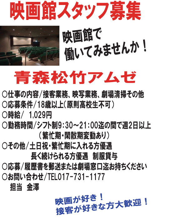 青森松竹アムゼ 営業時間 平日 10:00~22:00 土日祝 8:30~22:00 〒030-0845 青森県青森市緑3丁目9-2 サンロード青森 アムゼ地下1F TEL:017-731-1177 |